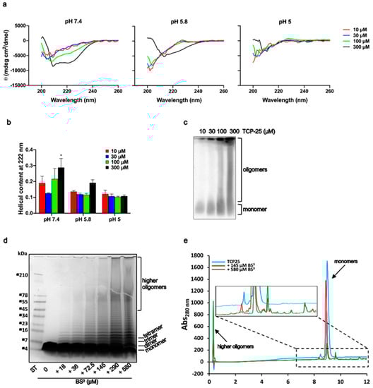 Given the propensity of TCP-25 to oligomerize in a concentration-dependent manner at pH 7.4, we decided to further analyze which oligomeric species were formed. For this purpose, freshly dissolved TCP-25 (10–300 μM) in 10 mM Tris at pH 7.4 was subjected to 4–16% (w/v) Blue native (BN)-PAGE. As shown in Figure 2c, TCP-25 formed a wide range of oligomers, and parts of the material did not enter the gel, indicating large oligomers or aggregates (bigger than 1500 kDa). To further characterize these oligomers, TCP-25 was chemically cross-linked with BS3.