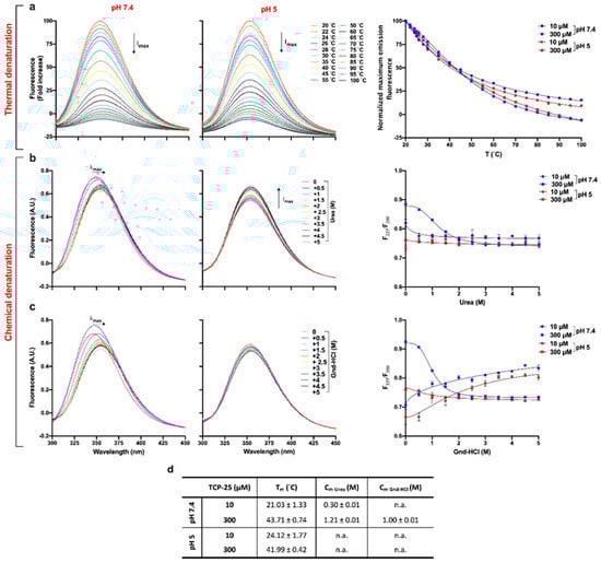 Tm was determined by fitting the normalized maximum emission fluorescence as a function of the temperature (Figure 3a, left panel). We found that Tm was more affected by the concentration than pH changes (Figure 3d), which is compatible with the observed oligomerization of TCP-25 at higher concentrations. To determine Cm, we used two different denaturant agents: urea (uncharged) and a salt of guanidine hydrochloride (Gnd-HCl). The latter is generally used when analyzing the specific contributions of hydrophobic or nonionic interactions to protein stability [45]. Therefore, we dissolved TCP-25 in the same conditions as above and incubated the peptide with increasing concentrations of urea or Gnd-HCl overnight before analysis. The results obtained for TCP-25 in the presence of both chemical agents are shown in Figure 3b–c.