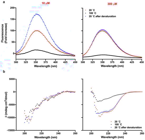 Thermal unfolding of a protein is generally characterized by irreversible aggregation. To investigate whether this was also the case for TCP-25, we analyzed the structural changes of the peptide before and after denaturation at 100 °C. First, we compared the intrinsic fluorescence spectra of TCP-25 at 10 and 300 μM in 10 mM Tris at pH 7.4 or in 10 mM NaOAc at pH 5 at 20 °C before and after denaturation. As shown in the left panel of Figure 4a, the fluorescence of 10 μM TCP-25 dissolved at pH 7.4 increased around 1.75-fold upon denaturation in comparison to the non-denatured peptide. Moreover, λmax was blue-shifted, which is indicative of aggregation of the peptide. Similar results were obtained for the peptide dissolved at pH 5 (Figure S3a).