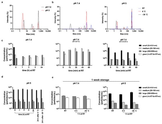 Size of oligomers and their distribution. (a,b) Representative size distribution by intensity of 300 µM TCP-25 in 10 mM Tris at pH 7.4 or in 10 mM NaOAc at pH 5.0. Sizes of oligomers at pH 7.4 (c,e) and pH 5.0 (d,e), and their distributions after storage at RT, 4, or –20 °C for up to 24 h (c,d) or after 1 week of storage (e). Oligomers were classified into 4 families: small (0.4–5 nm, black bars), medium (20–150 nm, light gray bars), large (200–950 nm, dark gray bars), and giant (1×103 – 5×103 nm, white bars). For each sample, spectra were recorded three times with 11 sub-runs using the multimodal mode. In the graphs, the concentrations of the oligomers belonging to different families are reported as the average ± SD (n = 2).