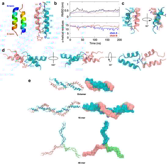 Collectively, our results suggest a structurally reliable interface of the tilted, primarily alpha-helical anti-parallel dimer configuration. From these dimer models, we next built higher-order multimers using docking. The exposed termini of the dimer are oppositely charged, so they are predicted to form an interface for the formation of higher-order end-to-end oligomers. These dimers are predicted to be stabilized via interactions at acidic residues, including D14 and E18, as well as basic residues, such as K6, K7, and K11 (Figure 6d).