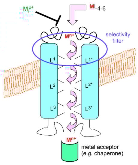 Schematic representation of a transmembrane metal transporter. Mn+ (red) is the transported cation, L1, L2, etc. the transporter-associated transient metal ligand sets, and Mip+ (green) a potential metal inhibitor of transport.