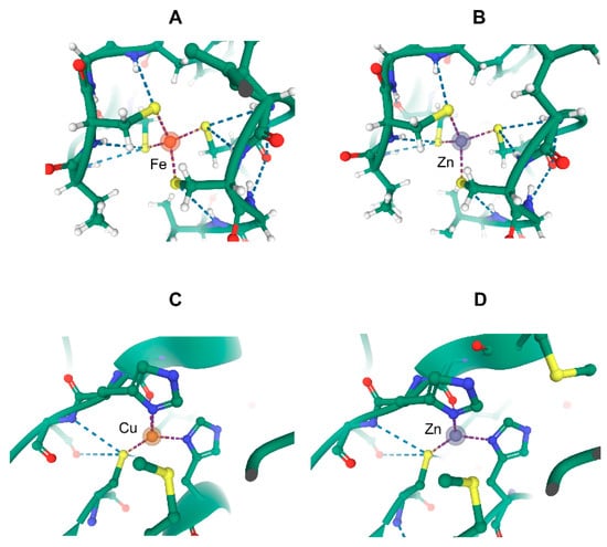 Comparison of the metal-substituted recombinant Clostridium pasteurianum rubredoxin and Pseudomonas aeruginosa azurin produced in Escherichia coli. The panels show the metal ion coordination spheres for (A) Fe(III) rubredoxin (RCSB PDB 1IRO, resolution 1.10 Å), (B) Zn(II) rubredoxin (1IRN, resolution 1.20 Å), (C) Cu(II) azurin (5AZU, resolution 1.90 Å), and (D) Zn(II) azurin (1E67, resolution 2.14 Å). The images were generated on the rcsb.org site using Mol* ((D). Sehnal, A.S. Rose, J. Kovca, S.K. Burley, S. Velankar (2018) Mol*: Towards a common library and tools for web molecular graphics MolVA/EuroVis Proceedings. doi:10.2312/molva.20181103).