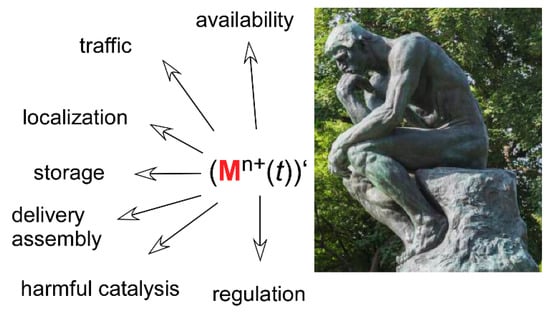 The properties and reactivity of all ions of transition metals are relatively similar. Thus, cells deploy sophisticated means to select only one of them or for assembling relatively complex prosthetic groups when only one specific feature of a given metal is needed. This quest for the right metal in the right place is mandatory to avoid unwanted side reactions. Yet, the uniqueness of the catalyzed reaction/function–metal (group) relationship is not mandatory. In the microbial world, evolution managed to swap metals in some cases to adjust to their environmental availability. However, the recognition of a metal by the coordination sphere of a (would-be metallo) protein is not enough to guarantee selectivity in higher eukaryotes that do not have the genomic plasticity of microbes (and definitely less time and chances to develop it). Hence, metal exchange and channeling through particular pathways ensures metal homeostasis and, consequently, cell welfare. With only a few exceptions, these pathways have been detailed, or altogether discovered, over the last two decades only. This implies that a lot remains to be elucidated, including the interrelationship among the newly identified components. These biochemical reactions are inherently transient, which calls for methodological improvements tracking the metals inside cells, and hopefully later in organs and organisms, at the appropriate spatial and temporal resolutions. In this endeavor, Coordination Chemistry has a central place that is far more sophisticated than the mere definition of metal ligands and binding affinities. Indeed, the thermodynamic component of transition metal–protein interactions forms the basis upon which kinetic considerations will shape our understanding of metal homeostasis. With the legion of new methods, tools, concepts, and theoretical background that continuously develops, coordination chemistry will have to adjust to this moving landscape—a bonanza—and it will undoubtedly gain increased biological usefulness (Figure 5).