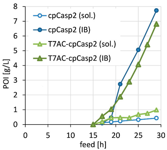 Direct comparison between cpCasp2 production with (T7AC-6H-cpCasp2) and without (6H-cpCasp2) solubility tag T7AC during carbon limited fed-batch cultivation (µ = 0.1 h−1) with constant 0.5 µmol IPTG /g CDM: expression of soluble (sol.) and insoluble (IB) POI in the course of time as volumetric titer [g/L].
