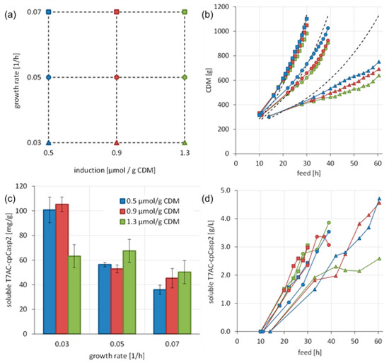 High recombinant expression of a POI leads to stressful situations for the host cell, resulting in protein misfolding in vivo, and consequent aggregation into IBs [48]. Several methods have been shown to prevent protein aggregation as reviewed by Costa et al. [25]. In our study, we attempted to develop fermentation and induction strategies for successful and efficient soluble protein production. A series of cultivation runs were conducted according to a Design of experiments (DoEs) approach (Figure 4a) with the production clone BL21(DE3) (pET30acer-T7AC-cpCasp2). The influence of different growth rates (µ = 0.03, 0.05 and 0.07 h−1) and induction strengths (0.5, 0.9 and 1.3 µmol IPTG/g CDM) were investigated regarding cell growth (Figure 4b) and soluble and insoluble recombinant protein production (Figure 4c,d).