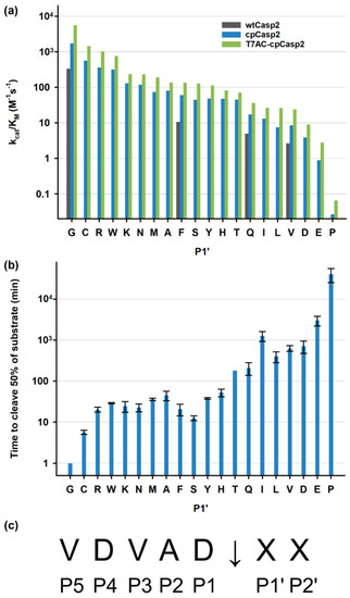Caspase-2 cleaves after the amino acid sequence VDVAD, even if followed by proline [17,50], but cleavage kinetics are influenced by the amino acid in the P1′ site. This influence of the P1′ amino acid on the cleavage kinetics was investigated by measuring Michaelis–Menten kinetics with a peptide substrate-based FRET assay. The substrates had the general structure of fluorophore-VDVAD↓XA-quencher, with X being any amino acid (Figure 1c). For wtCasp2 only G, F, Q, and V could be determined, due to the low sample amount. Figure 6a shows kcat/KM for all three Casp2 variants. The Michaelis–Menten kinetics are highly dependent on the P1′ amino acid, with glycine exhibiting the highest kcat/KM and proline the lowest. The kcat/KM values span almost five orders of magnitude for both cpCasp2 and T7AC-cpCasp2, as shown in Table 2. Full values can be found in the Supplementary Materials (Table S5). The differences in kcat/KM are mostly driven by kcat and not by KM, which indicates that the P1′ site strongly influences the rate of the cleavage reaction but not the affinity (see Supplementary Material File S6).