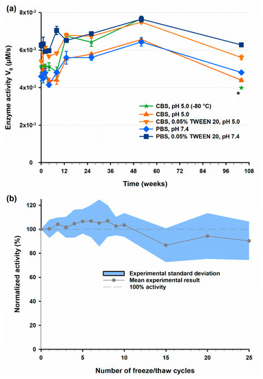 Storage stability of T7AC-cpCasp2 was investigated in different buffer systems at −20 °C for two years. The stability was evaluated by enzymatic activity and a sample stored at −80 °C was used as control. Figure 8 shows that T7AC-cpCasp2 exhibits excellent long-term storage stability in citrate or phosphate based saline buffer systems with 0.05% polysorbate (TWEEN) 20. Alternatively, similar stability can be reached without the addition of surfactant at −80 °C. The resistance to freeze/thaw degradation can be seen in Figure 8b, were no significant decrease in activity could be detected over 25 freeze/thaw cycles (Student’s t-test, two-tailed p-value = 0.1123, n = 9, α = 0.95).