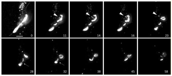 Live cell imaging has provided important insights into gap junction biology while also generating many unanswered questions. In Figure 1, we show data from imaging of Cx43-mEmerald using the lattice light sheet microscope (LLSM) at the Janelia Research Institute, which maximizes spatiotemporal resolution of live cell imaging. Stable cell lines were generated in BWEM cells, a fetal myocyte line [75] that expresses abundant endogenous Cx43 to minimize effects of tagged Cx43 on trafficking and gap junction assembly [37]. While imaging a group of large gap junctions for over an hour, we saw what appeared to be a single, continuous single gap junction that degraded through at least two mechanisms (Figure 1): at minutes 11–23 we observed multiple vesicles leave the center of the plaque in a train-like fashion (arrow in Figure 1) followed by apparent collapse and reorganization of the gap junction plaque (Video S1 available in Supplementary Materials). Over the next 40 min the fluorescence intensity of the plaque diminished greatly, however some areas seemed to maintain a high concentration of connexons (intense white staining similar to starting images) while in other areas fluorescence faded dramatically. These events indicate that specific subdomains in the gap junction can be targeted for an endocytic process while other areas can maintain high concentrations of connexons while other adjacent areas may lose, or at least not replenish, connexons. We also visualized merging of two large plaques over minutes 28–32 followed by shrinking of these structures, but similar to the gap junction above, there was a segregation or perhaps a concentration of an intensely fluorescent subdomain that remained through the course of our timelapse. Note this system has limitations as we cannot distinguish between “new” incoming Cx43 and connexons already residing in the gap junction. For example, the endocytic vesicles may have been a result of segregation of old Cx43 that is targeted for degradation, as has been reported [38]. Nor could we clearly distinguish whether the endocytic vesicles were in fact connexisomes, which would contain connexons from both adjacent cells or whether they contained Cx43 only from their respective parent cells. If they were connexisomes, it is quite intriguing that they exited the plaque as multiple connexisomes; a process that would seem to require a great degree of organization and coordination involving cystoskeletal and associated proteins. We know that phosphorylation regulates interaction of Cx43 with other proteins and can alter gap junction stability, thus kinase interactions at the gap junction could drive formation of specific gap junction subdomains that are targeted for different fates.