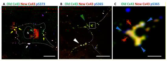 To better understand how subdomains could be organized we utilized the HaloTag system to perform pulse chase experiments allowing us to distinguish newly synthesized Cx43 from old and combined this with immunofluorescence using Cx43 phosphospecific antibodies to visualize differential phosphorylation based on the “age” of Cx43 in a gap junction and its organization into gap junction subdomains (see Figure 2). We created stable cell lines expressing Cx43 with a C-terminal HaloTag. We first incubated these cells with the Alexa488 HaloTag ligand that fluoresces green and after an hour washed and incubated with the TMR HaloTag ligand that fluoresces red. Cells were fixed, stained with phosphospecific antibodies (in blue), and imaged using airyscan super-resolution microscopy. Consistent with the reported pathway for Cx43 synthesis and previous results from many groups (e.g., [76,77,78]), we found newly synthesized Cx43 could be seen in the cytoplasm where the staining that appeared could be seen in the cytoplasm where the staining is consistent with its anterograde trafficking through the Golgi Apparatus [79] (Figure 2A, red staining and arrowhead near the nucleus (N)), while most large gap junctions showed a mix of old (green) and new Cx43 (visible as yellow or white, noted by colored arrows). Small, apparently new gap junctions typically lacked green fluorescence and were visible as red or purple, while green only structures could be seen in the cytoplasm representing internalized Cx43 (green arrowheads). Phosphorylation on S373 (pS373) occurred predominantly on gap junctions containing both old and new Cx43, (mostly visible as white, e.g., Figure 2A, white arrow) and, as reported before [56], appeared to occur homogenously on larger gap junctions. In Figure 2B, which includes staining for phosphorylation on S365 (pS365), we see considerable mixing of green and red Cx43 but also do see regions that contain predominantly green/yellow fluorescence (green arrowhead in Figure 2B) while in other areas plaques appear white indicating high levels of pS365 (white arrowhead in Figure 2B). Separate panels for each fluorescent channel are presented in Supplementary Figure S2 along with an overexposed image of Cx43 to help judge cell edges. When we focus in on individual structures (Figure 2C) we begin to see specific subregions that have more intense red fluorescence (red arrowheads) while 365 phosphorylation is quite distinct and concentrated within specific subdomains (blue arrowheads). We clearly observed this phenomenon in complex structures similar to the ones seen in Figure 1 indicating these regions may play a role in dynamic rearrangement and breakdown of gap junctions.
