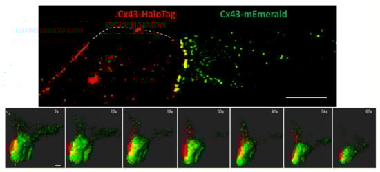 To distinguish gap junction degradation via connexisome formation and other means, we mixed cells expressing either Cx43-mEmerald or Cx43-HaloTag labeled with the Janelia Fluor® 647 ligand. As shown in Figure 3, top panel, mixing of these cells results in gap junctions that fluoresce yellow. Our intent was to utilize this system to visualize formation of connexosomes (also known as annular gap junctions) which would be identifiable as yellow cytoplasmic vesicles in our system. Again, we imaged cells on the Lattice Light Sheet microscope which, interestingly, provided enough spatial resolution to visualize the green and red interfaces, in addition to yellow overlap (visible in Figure 3). To our surprise, we saw little to no evidence of connexosome formation after imaging dozens of cells with yellow interfaces for up to 40 min (1 z-stack/2 s) after TPA treatment (Figure 2, see Video S2 in Supplementary Materials). In these BWEM cells, we found that rather than large scale endocytic events driving turnover, most gap junctions would “shrink” (measured after correction for photobleaching) via loss of small, almost exclusively single-color vesicles (0.1–0.5 µm) (Figure 3 and Supplementary Video S2), adding further evidence that multiple routes of disassembly exist. This could have important consequences for cell signaling as internalization of a connexisome would maintain the gap junction structure and its potential role as a scaffold for interacting cytoplasmic proteins, while decoupling it from intercellular communication; on the other hand, the deconstruction of gap junctions and Cx43 internalization we observed in BWEM cells would destroy the scaffold. Regulation of this process could then, both affect and be a reflection of gap junction stability as well as other cell behavior.