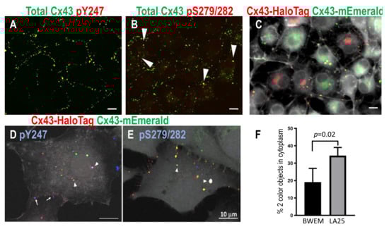 Src is well known to regulate Cx43 and modulate its phosphorylation in a dynamic manner [31,46,80,81]. Src activity leads to a decrease in gap junctions and channel gating and Src directly phosphorylates Cx43 on at least Y247, Y265, and Y313 [80,81,82]. Src activation also increases the activity of multiple other kinases that can and do phosphorylate Cx43 particularly MAPK at residues S279/282 (e.g., [46,83,84]). Immunostaining of LA25 cells (which express temperature-sensitive v-Src and endogenous Cx43) with antibodies to total Cx43 and phosphospecific antibodies to sites phosphorylated by Src (pY247) and MAPK (pS279/282) showed distinct staining where gap junction plaques and large circular cytoplasmic vesicles were positive for pY247 while only the cytoplasmic vesicles were pS279/282 positive (Figure 4A,B, separate panels for each fluorescent channel are presented in Supplementary Figure S3). To determine whether these structures were, indeed, connexisomes, we utilized the Cx43-mEmerald:Cx43-HaloTag approach in LA25 cells to identify bona fide connexisomes. Cells were mixed and allowed to grow for 24–48 h; TMR, a red HaloTag ligand was added, then cells were fixed and stained with AlexaFluor350 phalloidin to mark the plasma membrane (shown in grayscale); yellow objects in the cytoplasm were considered to be connexisomes and were clearly visible in LA25 cells (Figure 4C). Immunostaining with phospho-specific antibodies in this system also showed pY247 (in blue) in both gap junctions and connexisomes while pS279/282 was found at the highest levels in connexisomes (Figure 4D,E, white arrowheads indicate objects showing three color fluorescence as white). Furthermore, quantification of connexisomes in BWEM and LA25 cells showed twice as many in the cells expressing activated Src (Figure 4F). Thus, Src and MAPK may act cooperatively and sequentially to induce connexosome formation. This may not be the only route to connexosome formation, but it does indicate that spatiotemporal interaction of Cx43 with kinases may control the process.