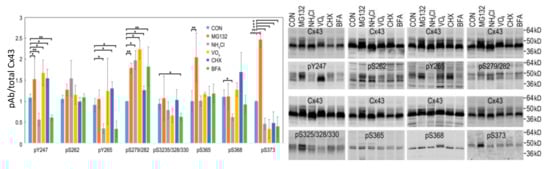 Cx43 present in gap junctions has been reported to be turned over by both the proteasome and lysosome [63,85,86,87]. Inhibition of the proteasome for 1–4 h (equivalent to 0.5–2 Cx43 half-lives) causes an increase the amount of Cx43 present in gap junctions with little change in total Cx43 while lysosomal inhibition can cause modest increases in total, mostly nonjunctional Cx43 that runs faster in SDS-PAGE (e.g., [35]), as also shown here in Figure 5 (also shown grouped by inhibitor in Supplementary Figure S5). Proteasomal inhibition had the most dramatic effect on Cx43 phosphorylation leading to a significant increase in several Cx43 phosphorylation events including pY247, pY265, pS279/282, pS365, and pS373. Lysosomal inhibition nearly eliminated phosphorylation by Src on pY247, pY265 while diminishing pS368 and pS373 and increasing pS279/282 levels. Tyrosine phosphatase inhibition (Na3VO4) increased phosphorylation on pY247 and pS279/282 with no significant change in pY265 while decreasing pS373. Inhibition of protein synthesis had more modest effects in general but increased levels of pY247, pY265, and pS279/282 but decreased pS373. BFA decreased pY247, pY265, pS325/328/330, and pS373 but increased pS279/282. These data exemplify the complex spatiotemporal regulation of Cx43 and gap junction stability as essentially no sites responded to these inhibitors in concert; even pY247 and pY265, both Src sites, showed differential responses to MG132 and CHX. Interestingly, MAPK phosphorylation on S279/282 was increased under all conditions indicating that interaction with MAPK may be quite promiscuous occurring at multiple subcellular locations while phosphorylation on S373 by Akt was diminished in all cases except proteasome inhibition, consistent with Akt mediated phosphorylation of Cx43 occurring only in the gap junction itself (also shown in Figure 2A and [56]).