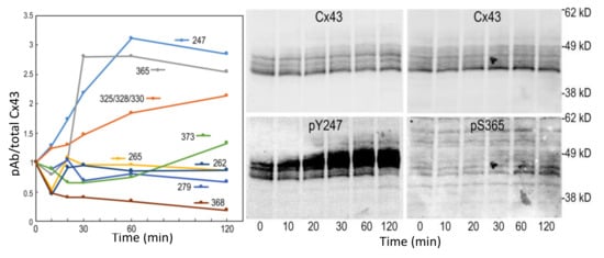 - Solan, J.L.; Lampe, P.D. Connexin 43 in LA-25 cells with active v-src is phosphorylated on Y247, Y265, S262, S279/282, and S368 via multiple signaling pathways. Cell Commun. Adhes. 2008, 15, 75–84. [Google Scholar] [CrossRef] [PubMed]