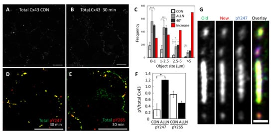 Immunofluorescent staining of LA25 cells for total Cx43 (Cx43IF1) in the absence (A) or presence of a proteasomal inhibitor (B) and the resulting quantification of junction size (C) comparing control to the proteasomal inhibitor ALLN (red bars indicate the percent increase elicited by proteasome inhibition) and cells incubated at 40 °C (src inactive). In (D,E), cells were stained for total Cx43 (green, Cx43IF1) and pY247 (D, red) or pY265 (E, red), resulting overlay is yellow, and the ratios are indicated in (F). G shows a higher magnification view of a large gap junction showing old, new, and pY247 subdomains. A, B, D, F Mag bars are 20 µm, G is 1 µm. * and *** indicate p < 0.05 and p < 0.001, respectively.