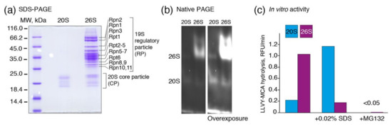 (a) The purified 20S (1.5 μg) and 26S (5.0 μg) proteasomes were subjected to polyacrylamide gel electrophoresis and further stained with Coomassie blue R250. Subunits of the 19S regulatory particle and the molecular weight marker are indicated. (b,c) The activity of 20S and 26S proteasomes was analyzed by native PAGE further saturated with Suc-LLVY-AMC (b) or measured in the presence or absence of 0.02% SDS and the proteasome inhibitor MG132 (c).