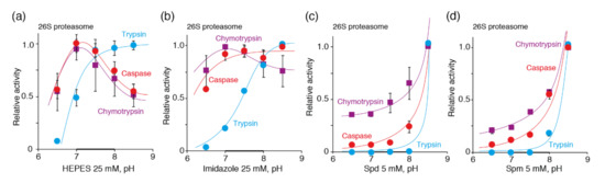Previously, it was shown that histone H3 significantly enhances 20S-mediated degradation of the oxidized B-chain of insulin in terms of the cleaving bonds, mainly after acidic and branched chain amino acids, i.e., positive allosteric activation of the caspase- and chymotrypsin- but not trypsin-like activities [47]. Indeed, measurement of the caspase- and trypsin-like activities of proteasomes in the buffers based on HEPES, imidazole, and the natural polyamines Spm and Spd at different pH levels (Figure 3) revealed that the caspase-like activity of the 26S proteasome follows the profile of the chymotrypsin-like activity in all buffers. The trypsin-like activity was increased, similar to the caspase- and chymotrypsin-like activities in the Spm- and Spd-based buffers. In the HEPES and imidazole buffers, the trypsin-like activity of proteasomes has its own profile, with saturation at pH values more than 7.5–8.0, as was reported previously [48].