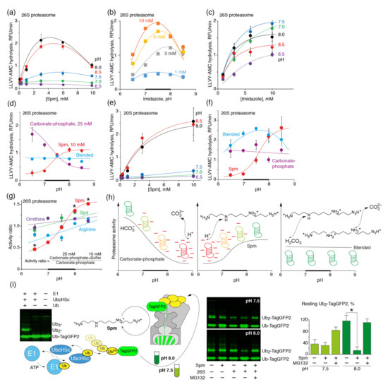 Spermine enhances the proteasomal chymotrypsin-like peptidase activity in a pH-dependent manner and counteracts carbonate-driven proteasome stalling at an alkaline pH. Chymotrypsin-like activity of the 26S (a,d) or 20S (e,f) proteasomes was measured at different pH and Spm concentrations (a,e) or at different pH in the amine buffer systems (d,f) containing 25 mM carbonate–phosphate (24:1) (violet), 10 mM Spm (red) or their mixture (cyan). (b,c) The pH dependence of the proteasomal chymotrypsin-like peptidase activity in the buffers containing various concentrations of imidazole at different pH. Activity of the 26S proteasome was measured using Suc-LLVY-AMC at the indicated concentrations of imidazole and pH values. The data represent the average and standard deviation (error bars) from four independent measurements. (g) Ratio of the chymotrypsin-like activity of the 26S proteasome measured in the 25 mM carbonate–phosphate buffer supplemented with 10 mM arginine (blue), ornithine (violet), Spd (green) or Spm (red) to the activity of the 26S proteasome measured in the 25 mM carbonate–phosphate buffer. Asterisks denote a statistically significant difference. The data were fitted to a polynomial square of an exponential or Gauss function and are shown as means ± SD (error bars) from triplicate determinations. (h) Deprotonation of the 26S proteasome by carbonate ions at an alkaline pH or by Spm at a neutral pH leads to proteasome inhibition. Simultaneous exposure of the 26S proteasome to Spm and carbonate results in proton transfer between bicarbonate and Spm at a neutral pH and protonation of carbonate ions by protons from Spm at an alkaline pH. The presence of Spm as a proton donor at alkaline pH protects the proteasome and thus preserves its activity. (i) Ub-TagGFP2 was ubiquitinated in vitro by a reconstituted E1-UbcH5c cascade and further mixed with the 26S proteasome at various pH levels in the presence or absence of Spm. Bars on the right represent the percentage of the di-ubiquitinated TagGFP2 hydrolyzed by the 26S proteasome compared with the control sample. Standard deviations are shown. The physiologically relevant pH range is shown by a bold line.
