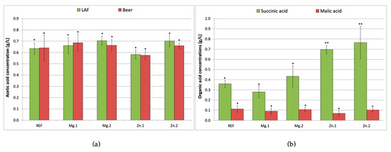 Acetic acid concentration (a) after 72 h of lactic acid (LAF) and ethanol fermentation (beer), and succinic and malic acid (b) in beer; REF: reference sample (without supplementation); Mg.1, Mg.2: wort supplemented with magnesium at two different levels; Zn.1, Zn.2: wort supplemented with zinc at two different levels. Bars show the average of three replicates ± standard deviation. * and ** indicate homogeneous groups within the same compound (p < 0.05).