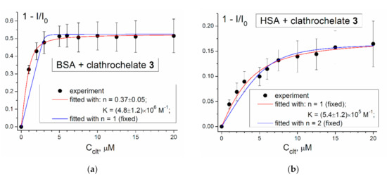 Figure 4. The plots of (1 − I/I0) vs. the concentration of the clathrochelate (Cclt) for a titration of 3 µM of bovine (BSA; (a)) and human (HSA; (b)) serum albumin with the clathrochelate 3, and the fit of these plots with the equation (2); I and I0 are protein fluorescence intensities in the presence and in the absence of 3 respectively. Tris–HCl buffer (0.05 M) with pH 7.9 was used as a solvent. Experiment performed three times, average values of (1 − I/I0) are presented; error bars correspond to standard deviation of the mean with confidence level of 0.9. Binding constant (K) value is found as the parameter of fitting; number of binding sites per globule (n) value is fixed where mentioned (see the corresponding legends) or found as the parameter of fitting otherwise.