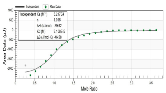 The binding constant of the 1:1 assembly 3–BSA that is equal to 3.2 × 104 M–1 was determined from ITC measurement, which indicates that this association is an enthalpy-driven process.