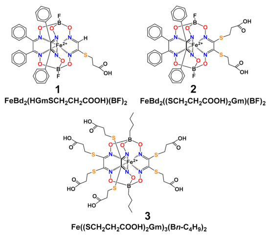 The dicarboxyalkylsulfide iron(II) clathrochelate (2) was prepared as described elsewhere [25]. The clathrochelate precursors FeBd2(HClGm)(BF)2 and Fe(Cl2Gm)3(BF)2 were obtained as described previously [28,29]. Monocarboxyalkylsulfide iron(II) clathrochelate (1) and hexacarboxyalkylsulfide iron(II) clathrochelate (3) were synthesized as described below.