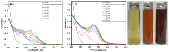 UV–vis absorption spectra of biomolecule-capped AgNPs recorded at 5 min time intervals for 5 to 45 mins (a) in bright sunlight ([AgNO3 = 2.0 mM, [Matricaria chamomilla L.] = 4%) and (b) in dark reaction conditions ([AgNO3 = 2.0 mM, [Matricaria chamomilla L.] = 4%). (Optical images of Matricaria chamomilla L. extract: AgNPs under dark conditions (a), and AgNPs under sunlight (b)).