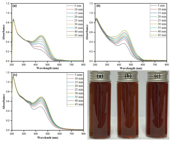 UV–visible absorption spectra of AgNPs recorded as a function of Matricaria chamomilla L. extract inoculum dose from 1% to 4%: (a) 1%, (b) 2.0%, and (c) 3%, at constant AgNO3 concentration (2 mM) and exposure for 5 to 45 min to bright sunlight. (Optical images of AgNPs at different Matricaria chamomilla L. extract concentrations: (a) 1%, (b) 2.0%, and (c) 3%, and constant AgNO3 concentration (2 mM)).