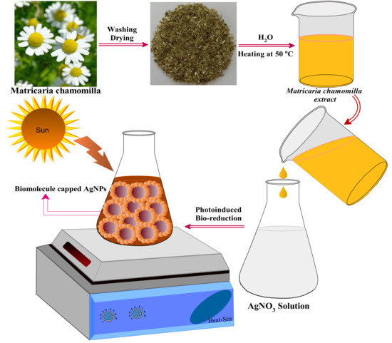 The importance of AgNPs among metal nanoparticles is well known due to their biological properties. It has been reported that AgNPs are proven to accelerate the potent inhibitor response against microorganisms, act as free radicle scavengers, and possess anti-inflammatory properties, having properties of antiviral, anti-angiogenetic effects, anti-bacterial, and wound healing [22,23,24]. Moreover, the photo-induced phytomediated synthesis of AgNPs from plant extract in the presence of visible light was proven a more economical and environmentally friendly method [25,26]. The literature emphasizes on the phytomediated synthesis and photo-induced route of AgNPs. The photo-induced synthesis of AgNPs has been reported from Cynodon dactylon and Andrachnea chordifolia in aqueous and ethanol extract, respectively [27,28]. The green approach for the biomolecule-mediated synthesis of AgNPs in the presence of sunlight has also been explored from extracts of Desmostachya bipinnata, Xanthium strumarium, Polyalthia longifolia, and Dunaliella salina, mostly acting as stabilizing and capping agents [29,30,31,32]. Chamomile (Matricaria chamomilla L.) belongs to the family Asteraceae (Compositae) and has a long history of being used as a medicinal herb throughout the world [33]. The herb, due to its therapeutic purpose, dates back to ancient Greece and Rome, where the herb was referred to by Asclepius, Galen, and Hippocrates [34]. The plant chemical constituents had proven diverse pharmacological actions and were used as anti-inflammatory, antiviral, sedative, antimicrobial, antioxidant, antispasmodic, and antiseptic agents. The potential chemical compositions with pharmacological response include blue essential oil with cosmetic significance, spiroethers, terpenoids, coumarins, and flavonoids with varied biological reactions [35,36]. In recent times, apigenin, apigenin-7-O-glucoside, quercetin, and luteolin in Matricaria chamomilla, also known as German chamomilla extract, have been determined [37,38]. Apigenin (4′,5,7-trihydroxyflavone) is a flavone under the category of natural flavonoids that is abundantly present in Matricaria chamomilla. It possesses antioxidant, anticancer, and anti-inflammatory properties [39,40]. The combination of rapid purification, liquid chromatography-mass spectrometry (LC/MS), LC/MS/MS, and nuclear magnetic resonance (NMR) was used to classify apigenin 7-O-glucoside and various acylated derivatives of apigenin-7-O-glucoside in chamomile petals [41]. Apigenin 7-O-glucoside is one of the major flavonoids present in the white florets of Matricaria chamomile with advanced anti-inflammatory, antioxidant, and anticancer properties [42,43]. Quercetin is also one of the copious flavonoids present in Matricaria chamomilla extract with strong anti-proliferative, antioxidant, and anti-inflammatory properties. Quercetin exhibits a wide variety of anticancer activities, and cancer-preventive properties are also indicated by accumulating data [44]. Luteolin (3,4,5,7-tetrahydroxy flavone) is a yellow crystalline flavonoid found in different plants including medicinal herbs (Matricaria chamomile) with antimicrobial, antioxidant, anticancer, anti-inflammatory, and neuroprotective activities [45,46]. Due to their quick, ecological, non-pathogenic, inexpensive method, the use of plants to produce AgNPs is of great interest [47]. Plant-mediated synthesis of AgNPs allows for advances in chemical and physical processes, which can be easily expanded for large-scale synthesis [48].