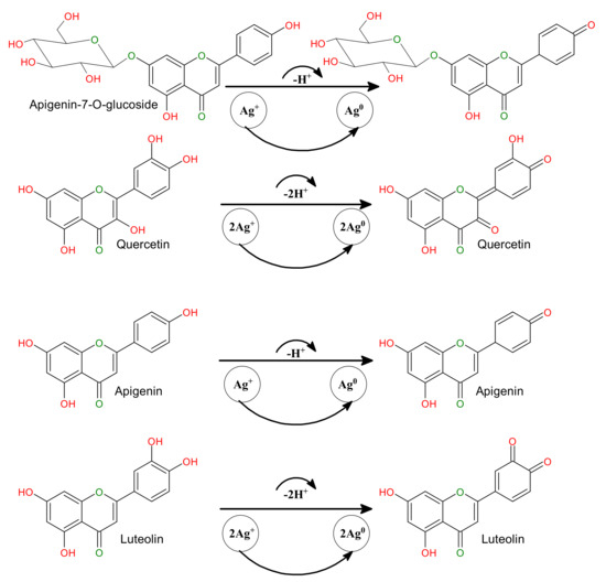 The proposed mechanisms behind the biomolecule-assisted synthesis of AgNPs using Matricaria chamomilla L. extracts as bio-reducing and capping/stabilizing agents have been explored on the bases of FTIR analysis of the Matricaria chamomilla L. aqueous extract, the photocatalytic effect of sunlight irradiation to accelerate the photoreaction, and the presence of the phytochemicals present in the Matricaria chamomilla L. extract. The observed peaks in the FTIR spectra clarify the possible contribution of –OH groups in the synthesis and stabilization of AgNPs. The photo-induced biomolecule-assisted synthesis of AgNPs can be understood from the resonance structures of flavonoids. The exposed flavonoids to bright sunlight absorb photons of energy and release electrons after excitation, and the deboning of –OH bonds reduces Ag+ to Ag0. The presence of protein molecules in Matricaria chamomilla L. extract is believed after the capping and stabilization of AgNPs. The enol form of the flavonoid gets converted to the stable keto form, as shown by the resonant structures in the systematic Figure 5. The release of H+ ions in the reaction mixture after bright sunlight irradiation reduces Ag+ to Ag0 while absorbing photons that converted the phenol groups to the stable keto form in flavonoids apigenin-7-O-glucoside and apigenin. Similarly, the two Ag+ were reduced to Ag0 in flavonoids quercetin and luteolin in the presence of bright sunlight and upon the absorption of two photons and the release of two H+ cations, as explored in the systematic Figure 5.