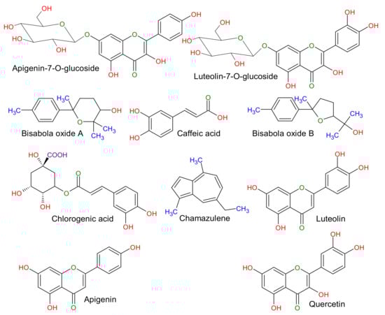 Many metabolites and reductive biomolecules in the plant extract are responsible for reducing metal ions and stabilizing/capping nanoparticles. These include terpenoids, flavones, ketones, aldehydes, amides, carboxylic acids, proteins, vitamins, and carbohydrates [59]. Matricaria chamomilla is considered among the influential group of cultivated medicinal plants, which comprises a large group of therapeutically interesting and active compound classes. The most common chamomile constituents are sesquiterpenes, flavonoids, coumarins, and polyacetylenes (Figure 6) [60]. Chamomile extract contains the most bioactive phenolic compounds, such as apigenin, apigenin-7-O-glucoside, luteolin and luteolin-7-O-glucoside (flavone), quercetin and rutin (flavonols), herniarin and umbelliferone (coumarin), chlorogenic and caffeic acid (phenylpropanoids), and naringenin (flavanone) [61].
