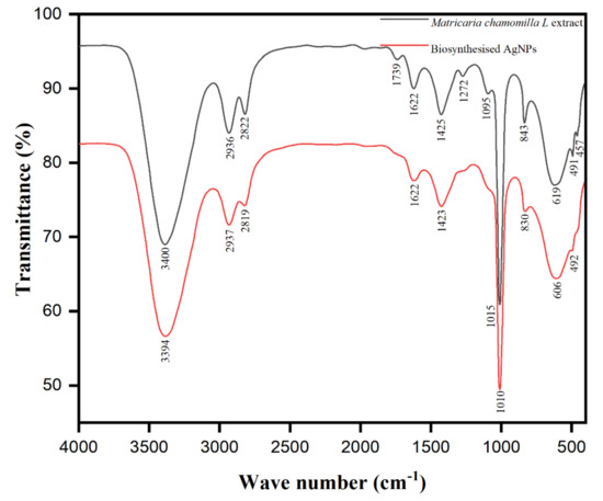 FTIR spectra of the Matricaria chamomilla L. extract and biomolecule-capped AgNPs.
