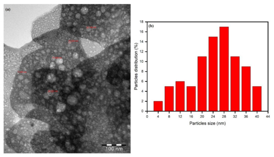 Transmission electron microscopy (TEM) is a useful nanoscience technique and nanotechnology to investigate the surface morphology and size of as-synthesized nanoparticles. The TEM images of as-prepared AgNPs using phytochemicals present in M. chamomilla extract as bio-reducing and capping/stabilizing agents are depicted in Figure 8a. The TEM image shows the abundance of approximately spherical-shaped biomolecule-capped AgNPs with the size ranging from 5 to 40 nm. The TEM analysis revealed that the AgNPs are efficiently stabilized by phytochemicals present in Matricaria chamomilla L. aqueous extract. A TEM image size distribution histogram shows that AgNPs range from 5 to 40 nm in size with an average size of 26 nm, as shown in Figure 8b. The size distribution histogram shows that the maximum AgNPs were in the range of 5 to 15 nm.