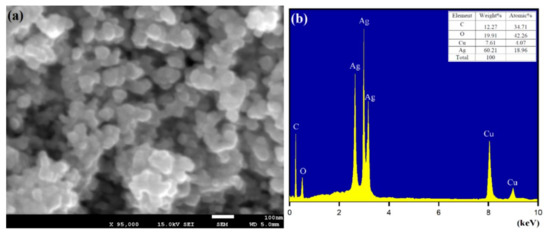 The scanning electron microscopy (SEM) and energy-dispersive X-ray spectroscopy (EDX) results accentuate the biomolecule-assisted synthesis of AgNPs, as shown in Figure 9a,b. The SEM analysis at 2 µm dimension scale shows the surface morphology of AgNPs with slight aggregation showing monodisperse spherical-shaped surface morphology. The EDX spectrum of AgNPs deposited on the copper grid conforms to the Matricaria chamomilla L. extract containing Cu, Ag, and O in an aggregation (existing in flowers and cylindrical appearance) as observed in SEM (Figure 9b). However, the presence of Cu and O is expected from the gird used to analyze the Matricaria chamomilla L. extract sample solution. The observed peaks at 2.9, 3.1, and 3.3 keV are the corresponding binding energies of Ag Lα, Ag Lβ, and Ag Lβ2. The obtained optical absorptions are the matching silver nanocrystalline peaks because of surface plasmon resonance [63,64]. Based on the obtained results, the biomolecule-assisted synthesis of AgNPs of Matricaria chamomilla L. extract was confirmed.