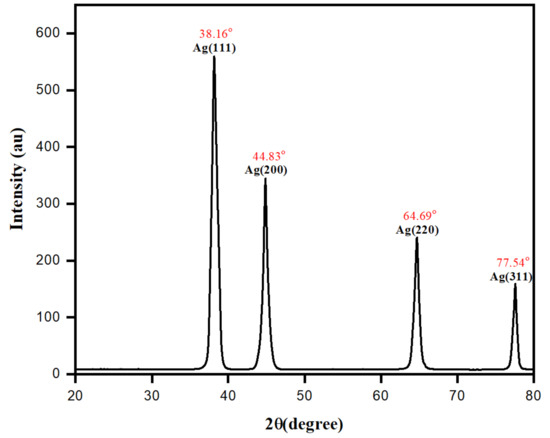 The crystalline structure of the AgNPs was studied using XRD analysis, as shown in Figure 10. The crystalline powder for XRD analysis was acquired from the dark brown silver sol after centrifugation, followed by multiple washings and complete drying in an oven. At a wide angular range of 20° ≤ 2θ ≤ 80°, XRD data of biomolecule-capped AgNPs were collected and discussed. As shown in Figure 10, the crystalline existence and purity of as-prepared AgNPs were confirmed by studying the XRD pattern. The observed diffraction peaks at 2θ of 38.16, 44. 83, 64.79, and 75.54 were indexed to Bragg reflections (111), (200), (220), and (311), respectively. The XRD pattern was obtained as per the standard powder diffraction (JCPDS) file no: 04-0783 corresponding to the silver metallic nanoparticles of the crystalline face-centered cubic (fcc) planer geometry. However, a similar finding was observed for AgNPs with intense Bragg reflected planes of diffraction [65,66]. The intensity of the peak corresponding to the (111) plane was greater than that of other planes, promoting the idea that AgNPs predominantly established along the (111) direction. Analysis of the X-ray diffraction (XRD) showed that most of the AgNPs were spherical. The average estimated crystallite size of the AgNPs estimated from the FWHM of the diffraction peak using the Scherrer equation, D = Kλ/βcosθ, was found to be 12.02 nm. As illustrated above, these findings were roughly consistent with the sizes of nanoparticles derived from the TEM analysis.