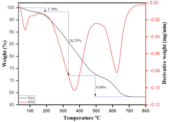 The simultaneous thermal gravimetric analysis/derivative thermogravimetry analysis (TGA/DTG) was performed to validate the development of stable AgNPs and determine the thermal stability of AgNPs using M. chamomilla extract as a capping or stabilizing agent. The TGA and DTG analyses are primarily conducted ahead to elevate the thermal stability and the weight loss by thermal degradation patterns accomplished in the presence of capping or stabilizer agents onto the surface of AgNPs. The literature accentuates the efficacy of biological molecules’ effectiveness as reducing/capping agents to determine the composition, shape, size, and surface charge of the growing nanoparticles [32,67]. Figure 11 displays the TGA/DTG curve of AgNPs, as recorded at a heating rate of 10 °C/min between 30 and 800 °C with the sample under a nitrogen (N2) atmosphere. The thermal decomposition of the AgNPs occurs in several steps and shows a total weight loss of 36.63% after thermal analysis to 800 °C. The first weight loss of 1.70% from 30 to 130 °C is due to the moisture content and absorbed water molecules present on the surface of the AgNPs. Upon further heating, the sample exhibited a second weight loss of 26.25% between the temperature range of 130 and 510 °C and the final weight loss of 8.68% took place at a temperature range of 510 to 690 °C. The degradation was observed between 110 and 510 °C, with a related weight loss of approximately 26.25% because of the decomposition of organic biomolecules present on the surface of AgNPs. The decomposition of phenolic, flavonoid, and other biomolecules originating in the Matricaria chamomilla extract, which are responsible for stabilizing AgNPs, can be attributed to this weight loss. In addition to a steady weight loss of approximately 8.68% above 510 °C, a thermal degradation of resistant aromatic compounds on the surface of AgNPs will probably be attributed to the cause [68]. These results are attributed to the vital role of the biomolecules present in the Matricaria chamomilla extract in the nucleation, growth, and stabilization of AgNPs. The thermal stability of biomolecule-assisted AgNPs depends directly on the decomposition temperature of their different functional groups. No further weight loss was observed upon additional heating to 800 °C.