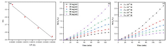where k is the rate constant, Ea is the activation energy (J/mol), R is the gas constant (8.314 J·mol−1·K−1), A is the pre-exponential factor, and T is the temperature in Kelvin. Meanwhile, the activation energy was obtained from the lnk vs. 1/T curve and was calculated to be 11.79 KJ/mol. The first-order kinetics was applied to deduce the RB degradation over AgNPs as catalytic doses, extending from 10 to 50 mg/ml, as depicted in Figure 13b.