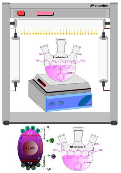 - Shaikh, W.; Chakraborty, S.; Islam, R. Photocatalytic degradation of rhodamine B under UV irradiation using Shorea robusta leaf extract-mediated bio-synthesized silver nanoparticles. Int. J. Environ. Sci. Technol. 2019, 17, 2059–2072. [Google Scholar] [CrossRef]