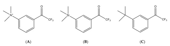 Chemical structure of related trifluoromethylketone molecules: (A): 1-[3-(trimethylamino)phenyl]-2,2,2-trifluoro-1-ethanone (TMTFA); (B): 2,2,2-trifluoro-1-[m-(trimethylsilyl)phenyl]-1-ethanone (Zifrosilone); (C): 1-(3-tert-butylphenyl)-2,2,2-trifluoroethanone (TFK).