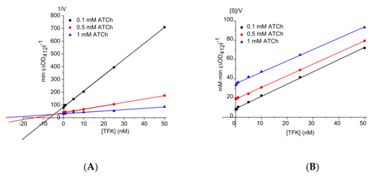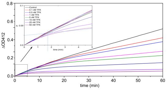 Inhibition of hAChE by CSP (0.21 µM) performed after different pre-incubation times in the presence of various concentrations of TFK (0.1–1 nM) showed that the biphasic progressive inhibition process of the enzyme is affected by TFK. The biphasic progressive inhibition was analyzed as a function of pre-incubation time and concentration in TFK.
