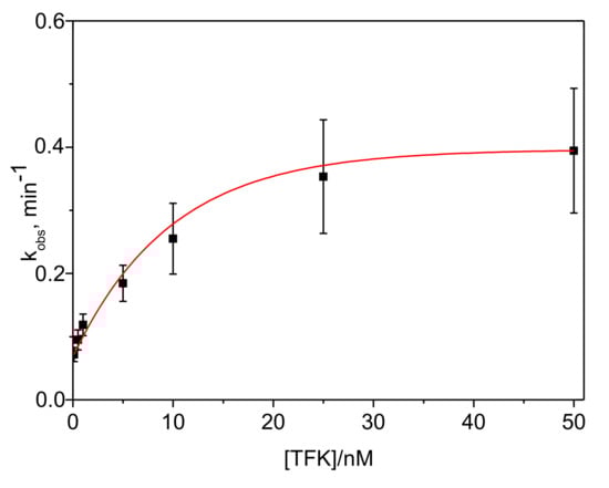 Dependence of kobs,max (fast process, see Equations (7) and (8)) of hAChE phosphorylation by CSP as a function of TFK concentration (after 120 min pre-incubation).