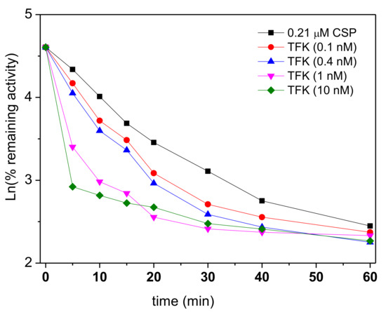 The slow recovery of enzyme activity depends on the TFK concentration present in the medium. In the presence of remaining 0.02 nM TFK (green curve), it takes less than 40 min to regain an activity similar to that of control enzyme at t = 60 min.
