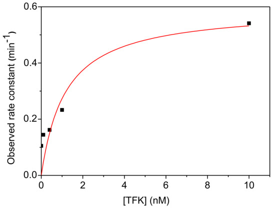 Typical dependance of kobs as a function of TFK concentration for inhibition in the presence of 0.1 mM ATC. The kobs values were determined from nonlinear fitting of progress curves in Figure 2 at three substrate concentrations. Data were fitted to Equation (3): ordinate is k−4 and asymptote is k−4 + k+4 in Scheme of Figure 5.