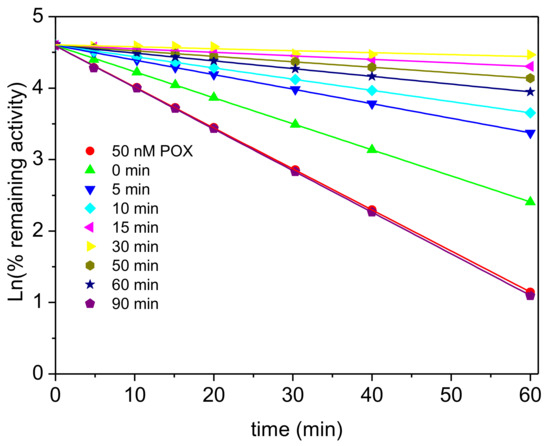 Then, we investigated the effect of TFK (1–10 nM) on AChE phosphorylation by 50 nM paraoxon. Unlike progressive inhibition of AChE by CSP, first order inhibition of the enzyme by paraoxon is linear as with most OPs. It was found that pre-incubation of AChE with TFK decreased the observed rate of phosphorylation. Thus, the effects of pre-incubation duration and TFK concentration on the rate of inhibition was directly quantified from the slope of Ln (residual Activity) vs time and pre-incubation duration the residual activity increased as pre-incubation duration and TFK concentration increased. The protective effect was maximum for 10 nM TFK (Figure 13) and reached a plateau after 40 min pre-incubation (Figure 14).
