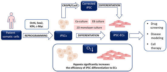 General scheme of induced pluripotent stem cells-endothelial cells (iPSC-ECs) utilization. Patient somatic cells may be used to obtain iPSC after delivery of Yamanaka’s cocktail of four transcription factors (Oct4, Sox2, Klf4, c-Myc), however, the process may be facilitated by hypoxia. After iPSC reprogramming and differentiation of iPSCs to ECs, the cells may be used in various applications. Low oxygen tension may also trigger vascular differentiation. The possibility to modify (correct) mutations in patient-specific iPSCs using CRISPR/Cas9 technology creates a unique opportunity for personalized investigations.