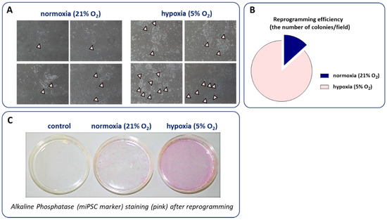 The influence of hypoxia on iPSC reprogramming. Cells kept in low oxygen concentration (5% O2) create more colonies (indicated by arrows) than cells cultured in atmospheric conditions (21% O2) as showed by (A) representative photos; (B) their calculation as well as (C) alkaline phosphatase (miPSC marker) staining after reprogramming.