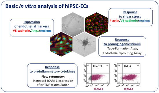 Characterization of hiPSC-ECs. Endothelial cells after differentiation from hiPSCs express endothelial markers (e.g., VE-cadherin, Angiopoietin 1-Ang1) and exert potent angiogenic capacity (they form tubule-like structures on Matrigel and spheres in endothelial sprouting assay). hiPSC-ECs properly respond to proinflammatory cytokines (the increase in ICAM-1 (intercellular adhesion molecule 1) expression is evident by flow cytometry analysis) and shear stress.