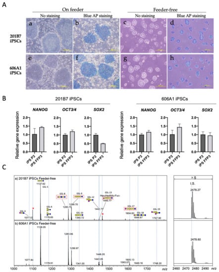 Evaluation of the pluripotent stem cell markers and GSL-glycan profiles of on feeder and feeder-free human iPSCs. (A) Representative microscopic findings of undifferentiated iPSCs 201B7 and 606A1. Both iPS cell lines formed typical colonies on feeder cells (a,e) and were stained with blue alkaline phosphatase (blue AP) (b,f). Under feeder-free conditions, typical iPSC colonies were observed (c,g) and confirmed by blue AP staining (d,h). Scale bars = 500 μm. (B) Gene expression analyses of pluripotent stem cell markers such as NANOG, OCT3/4, and SOX2 in iPSCs on feeder at passage 2 (iPS P2), and feeder-free iPSCs at passage 3 (iPS FFP3). Values are presented as means ± SD. (C) MALDI-TOF MS spectra showing GSL-glycans on feeder-free human iPSCs 201B7 (a) and 606A1 (b). Red asterisks (*) and dashed red boxes indicate free oligosaccharides and undifferentiated iPSC-specific GSL-glycans, respectively.