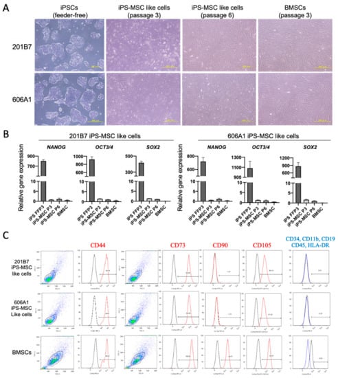 Disappearance of pluripotent stem cell markers and appearance of mesodermal markers during differentiation of iPSCs into iPSC-derived mesenchymal stem cell like cells (iPS-MSC). (A) Morphology of the iPS-MSC like cells differentiated from iPS cell lines (201B7 and 606A1) at passage 3 and 6, and human BMSCs at passage 3. Scale bars = 500 μm. (B) Gene expression analyses of pluripotent stem cell markers such as NANOG, OCT3/4, and SOX2 in feeder-free iPSCs at passage 3 (iPS FFP3), iPS-MSCs at passages 3 and 6 (iPS-MSC P3 and P6), and BMSCs (passage 3). Values are presented as means ± SD. (C) Expression of surface antigens in iPS-MSC like cells derived from both iPSC lines, and BMSCs as determined by fluorescence activated cell sorter (FACS) analysis. Representative FACS profiles of iPS-MSC like cells (P6) and BMSCs (P3) associated with the mesenchymal phenotype (red font: positive antibodies against CD44, CD73, CD90, and CD105; blue font: cocktail of negative antibodies against CD34, CD11b, CD19, CD45, and HLA-DR). Red profiles: population stained with positive antibodies; blue profile: population stained with negative antibodies; black profile: population stained with isotype control.