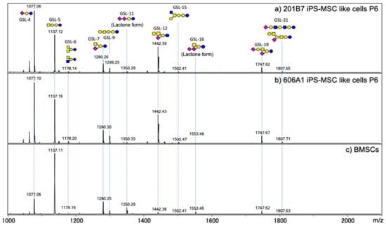 MALDI-TOF MS spectra of GSL-glycans. 201B7 iPS-MSC like cells (a), 606A1 iPS-MSC like cells (b), and human BMSCs (c).
